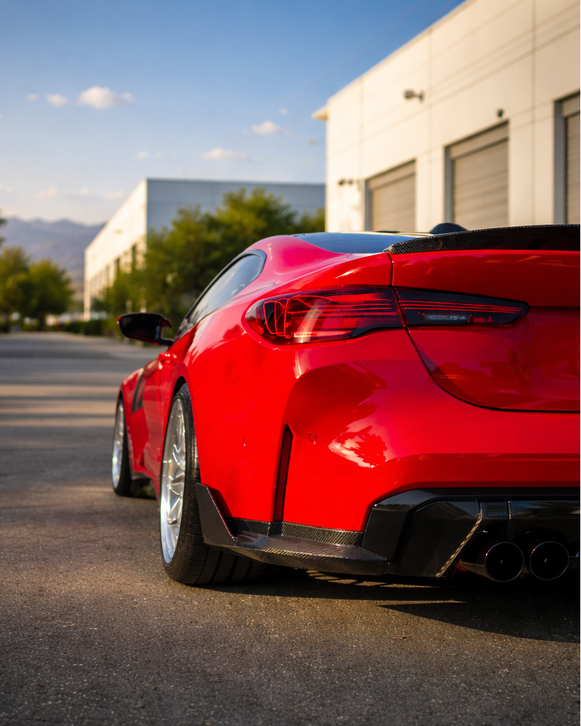 Enhance rear-end aerodynamics on your BMW G82 M4 with lightweight carbon fiber rear canards, designed to help manage airflow and improve high-speed stability.